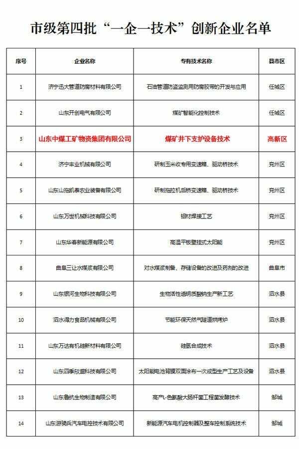 为进一步提升全市企业创新能力,根据《济宁市中小企业“一企一技术”创新企业认定办法》,经过层层严格筛选、考核,济宁市中小企业局于近日正式向社会公示济宁市第四批“一企一技术”创新企业名单,我集团凭借出色的煤矿井下支护设备技术创新成功入选。