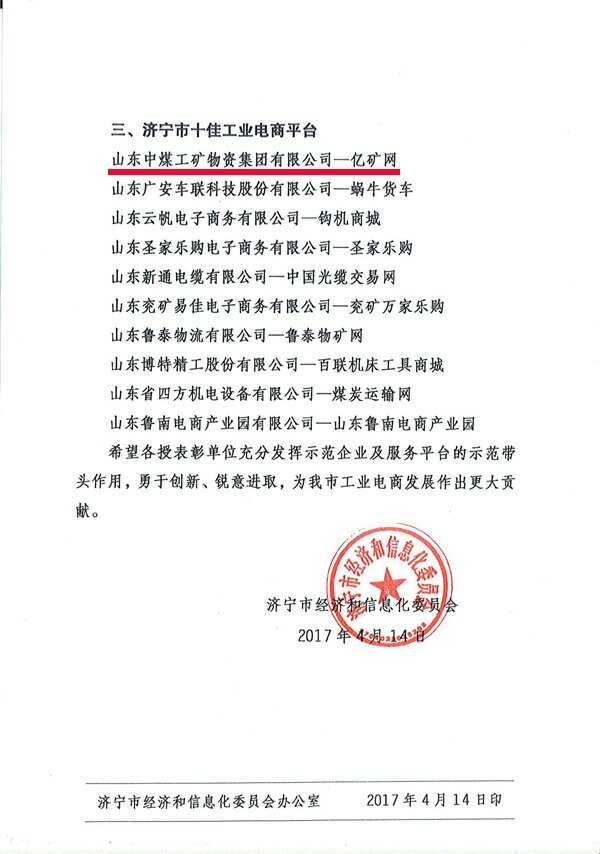 为贯彻落实《济宁市建设省信息技术产业基地行动计划(2015-2018年)》、《关于加快信息化与工业化深度融合的实施意见》等文件精神,加快全市工业电商融合发展,近日,经济宁市经济和信息化委员会研究决定,评选出了2017年度济宁市十佳电商平台。山东中煤集团自主开发运营的跨境电子商务平台——亿矿网成功入选。