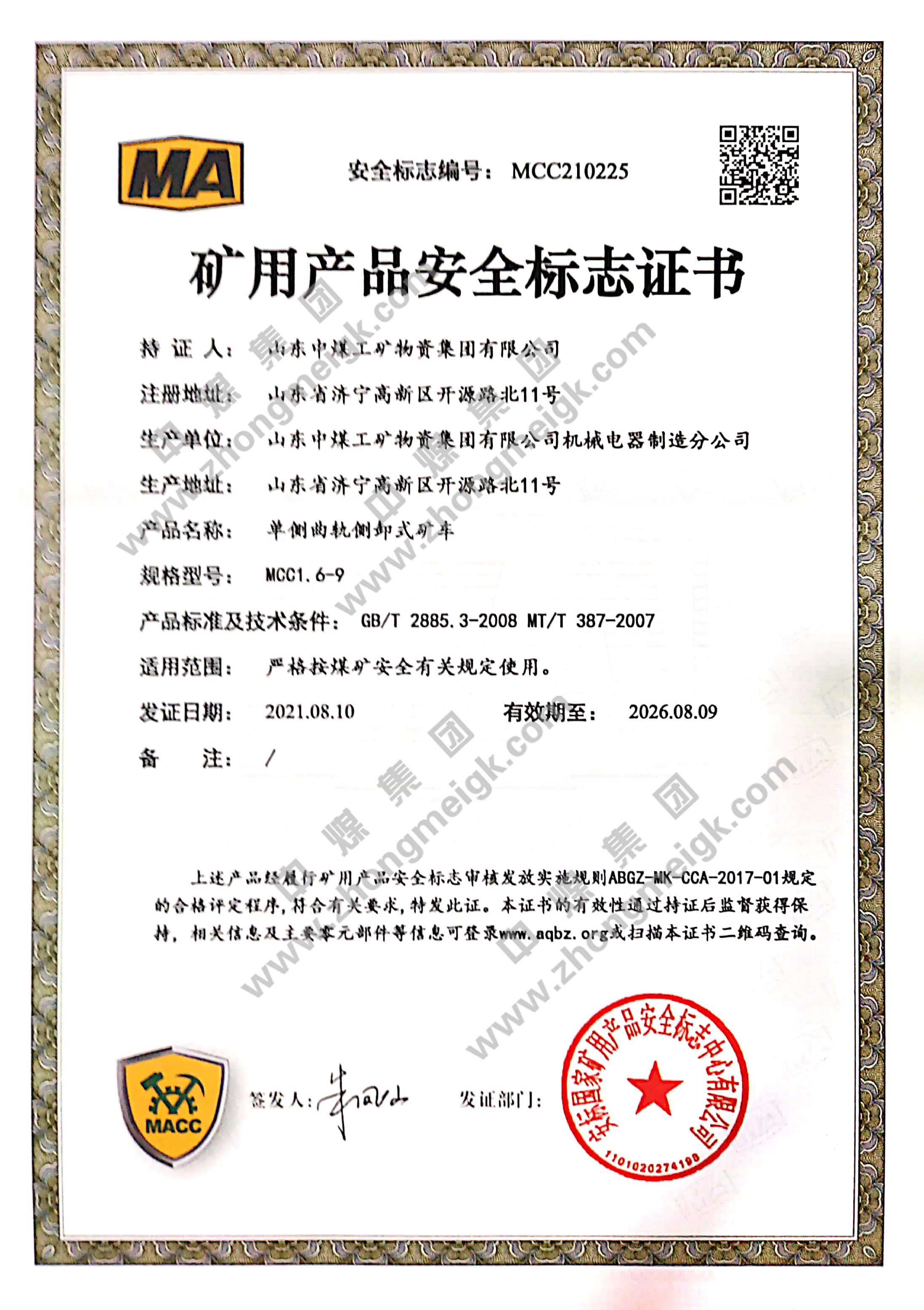 作为全国守合同重信用企业、全国煤矿专用设备及配件产品定点生产单位、中国运转设备10强企业、中国机械工业优秀企业、工信部制造业双创平台示范企业、山东省瞪羚企业、山东省企业技术中心、山东省工业突出贡献奖企业,中煤集团积极响应国家安全生产的要求,严把产品质量关,努力提升产品质量安全等级,积极开展矿用产品安全认证工作,截至目前已取得矿用单体液压支柱、刮板输送机、翻斗式矿车、固定车厢式矿车、平板车、材料车、绞车等多个系列产品共200多个型号的矿用产品安全标志证书,各项产品专利140多项,通过国家及省市质量技术监督检验部门颁发的产品检验报告200余项,在矿用产品安全研发方面综合实力雄厚。