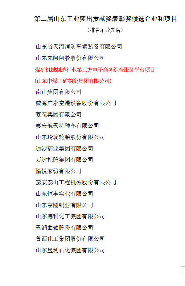 根据《山东工业突出贡献奖实施管理办法》,经过各市企业联会(经信委)推荐、资格审查、行业初评、实地考察、综合评审等多项严格考核,山东工业突出贡献奖大奖和表彰奖的候选企业和项目名单正式公示。山东中煤工矿集团及其开发运营的煤矿机械制造行业第三方电子商务综合服务平台项目成功入选山东工业突出贡献奖表彰奖候选企业和项目。